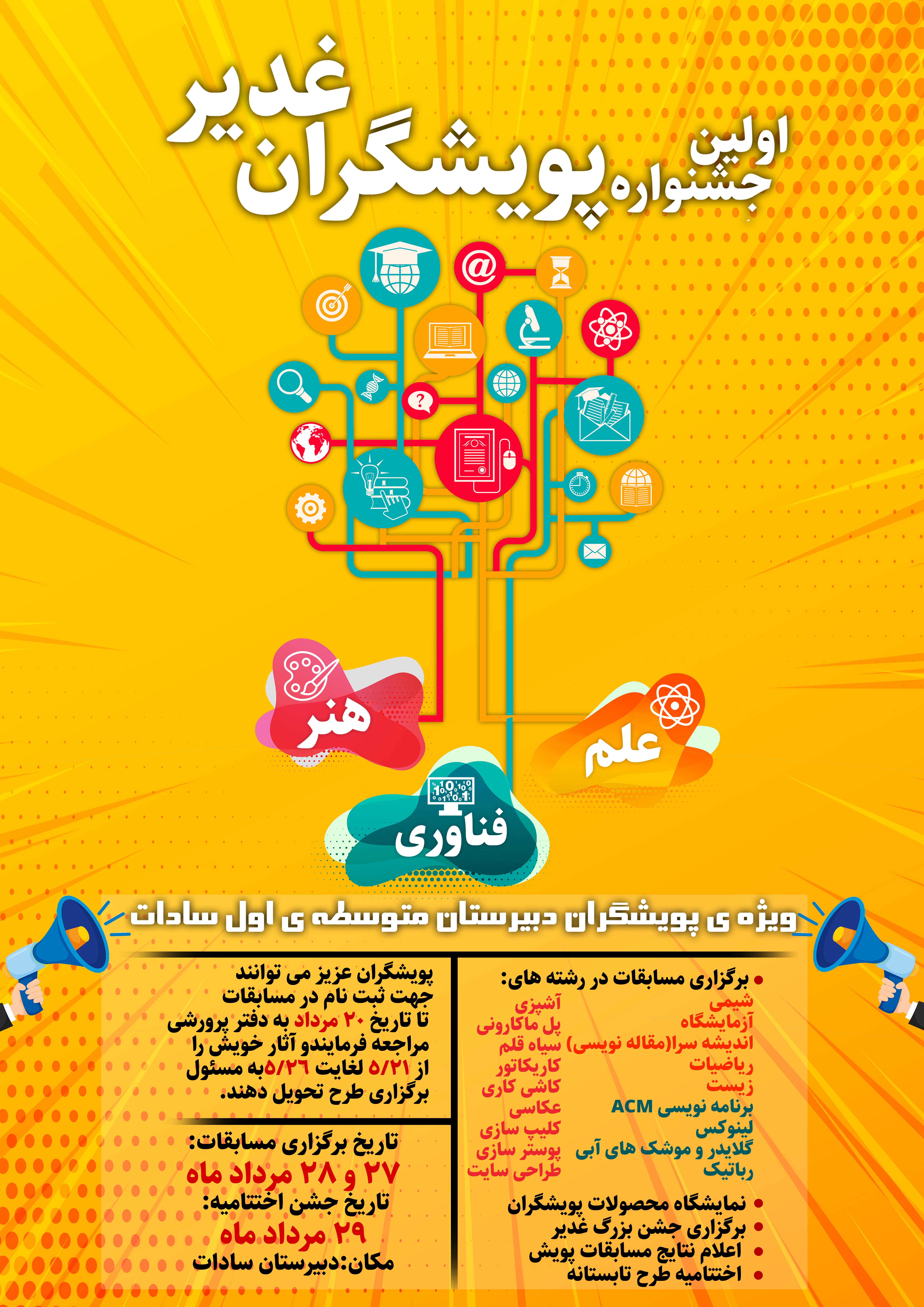 به اطلاع می رساند در کنار برگزاری جشن بزرگ عید سعید غدیر، نمایشگاهی از محصولات پویشگران برپا خواهد شد. این محصولات در زمینه های شیمی آزمایشگاه، اندیشه سرا (مقاله نویسی)، ریاضیات، زیست، برنامه نویسی ACM، لینوکس، طراحی ساست، گلایدر، موشک های آبی، رباتیک، آشپزی، پل ماکارونی، سیاه قلم و کاریکاتور، کاشی کاری، عکاسی، کلیپ سازی و پوسترسازی ویژه غدیر می باشد.