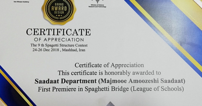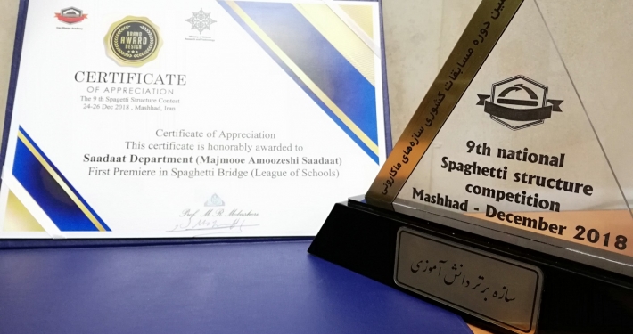 با انتخاب پل ماکارونی گروه دبیرستان سادات به عنوان سازه ی برتر، مقام نخست مسابقات ساخت پل ماکارونی دانش آموزان کشور به افتخارات علمی مجتمع آموزشی سادات افزوده شد.
