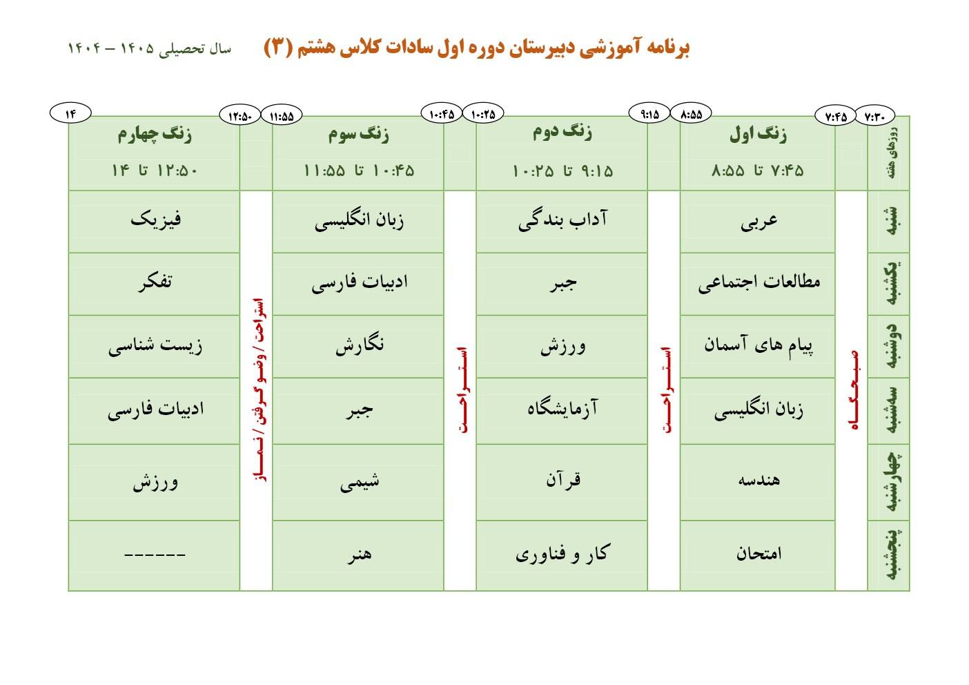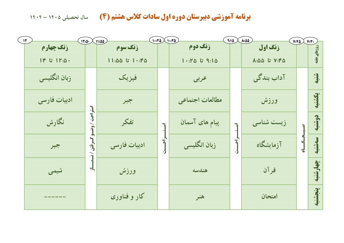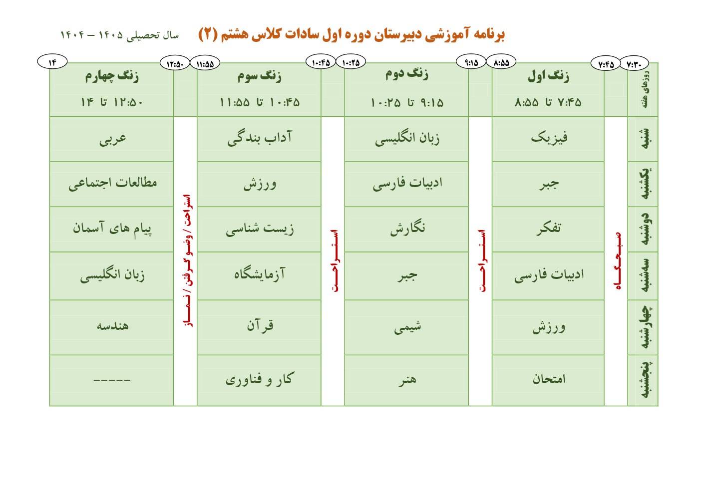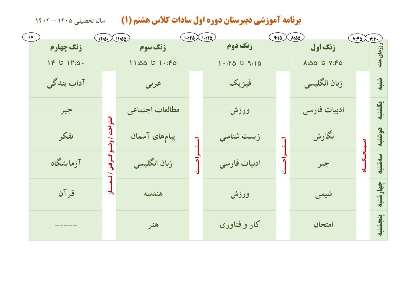 کلیه امور مربوط به دانش آموزان پایه هشتم را از طریق معلمین راهنمای این پایه (آقایان محمدی و ملکوتی خواه) پیگیری نمایید.